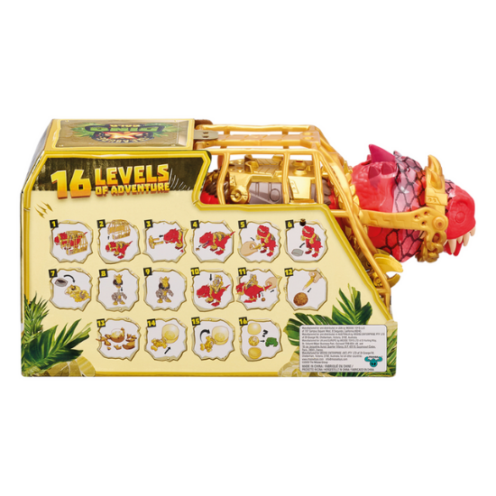 Czy poskromisz Dinozaura? Przejdź przez 16 poziomów przygody. Otwórz klatkę ze swoim olbrzymim Dinozaurem. Zdejmij kaganiec z paszczy dinozaura. Naciśnij kolce na jego głowie, aby dinozaur otworzył paszczę. W paszczy jest ukryty klucz. Ustaw dinozaura na tylnych łapach, aby odsłonić jego brzuch i sprawdzić, co jeszcze zjadł dinozaur. Otwórz narzędziem brzuch dinozaura. Odkryj wszystko, co dinozaur zjadł i złoty szlam. Znajdź elementy Łowcy dinozaurów. Złóż figurkę. Umieść na dinozaurze uprząż i figurkę, aby stworzyć walecznego dinozaura. Pociągnij dinozaura za ogon, aby odkryć ostatnią z niespodzianek. Spod jego ogona wypadnie okrągła skamielina. Rozłup ją. W środku jest kulka w kolorze bursztynu. Rozłup ją. Znajdziesz prehistorycznego szkodnika lub pokryty złotem meteor. Zestaw z kolekcji Treasure X Dino Gold Dinozaur to niesamowity, największy zestaw z kolekcji, idealny na prezent dla wszystkich fanów kolekcji Treasure X oraz fanów dinozaurów.